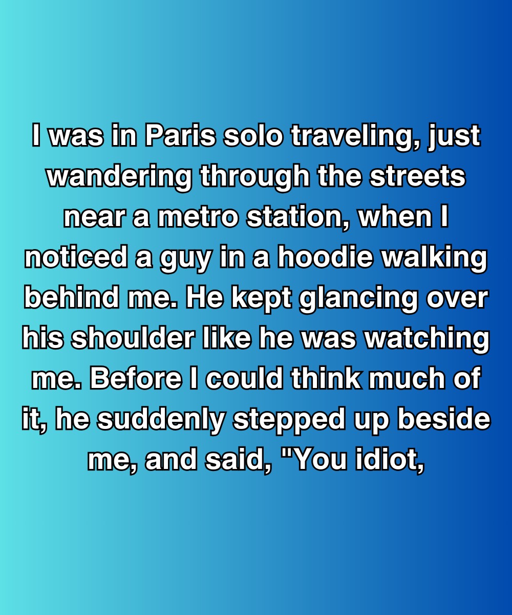 I was in Paris solo traveling, just wandering through the streets near a metro station, when I noticed a guy in a hoodie walking behind me. He kept glancing over his shoulder like he was watching me. Before I could think much of it, he suddenly stepped up beside me and said, “You idiot.”