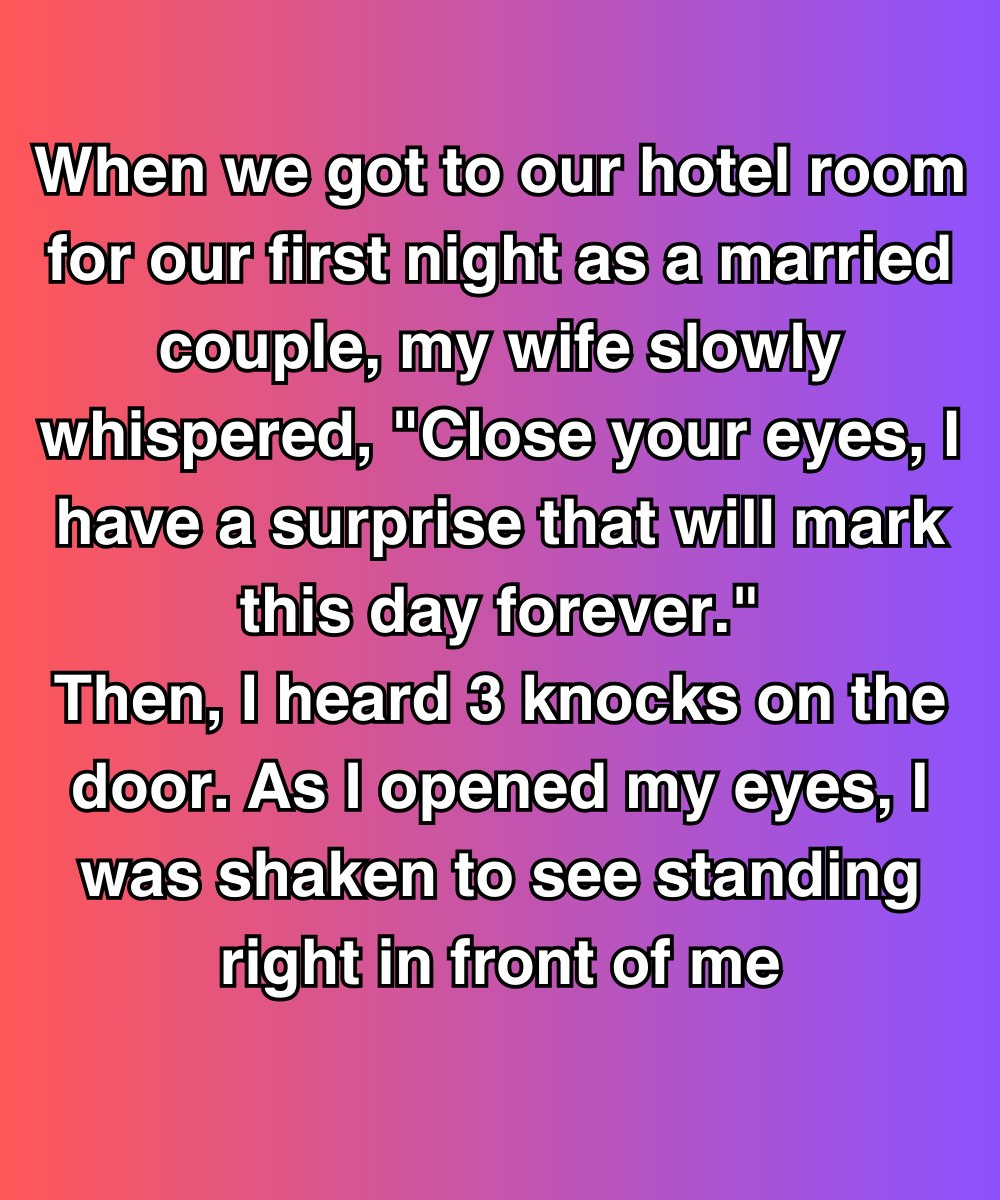 When we got to our hotel room for our first night as a married couple, my wife slowly whispered, “Close your eyes, I have a surprise that will mark this day forever.”