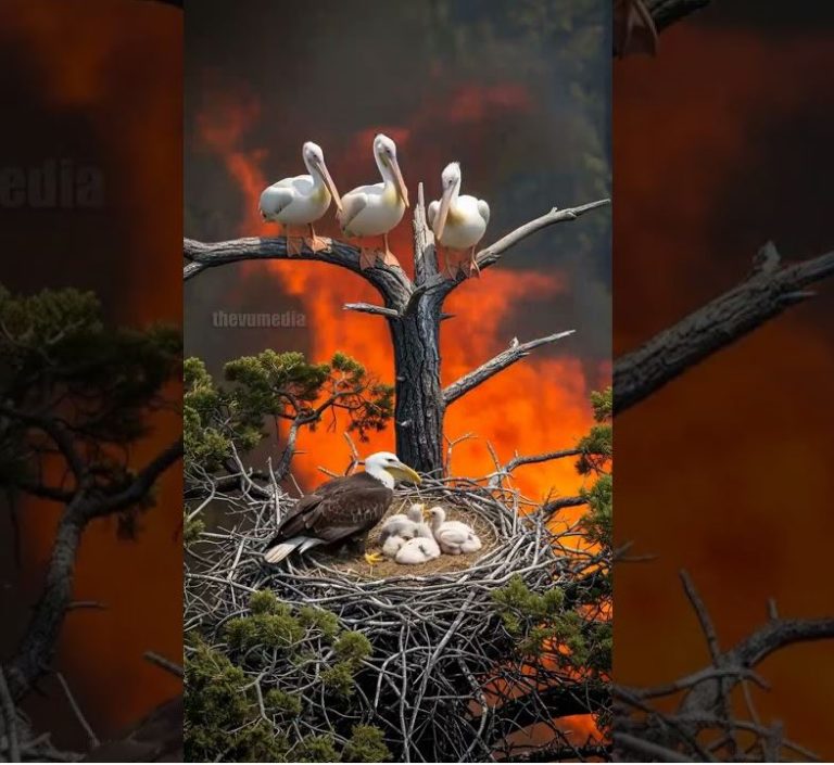 Three pelicans swooped down beneath the falling nest, spreading their massive wings to catch the fragile bundle of twigs and feathers. Others joined in, flapping hard to stabilize the fall. Working together with astonishing coordination, the pelicans managed to guide the nest toward the shallow shore, where it gently landed in the reeds.