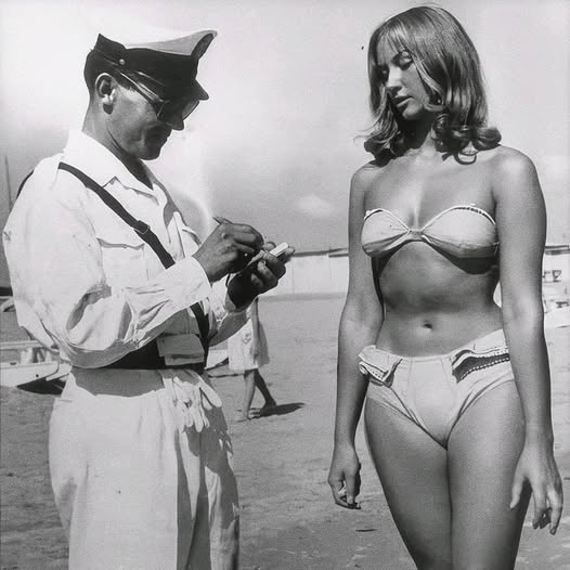 One image in particular captured this cultural tension. The now-famous black-and-white photo shows a young woman in a bikini standing on an Italian beach beside a stern-faced police officer holding a notepad.