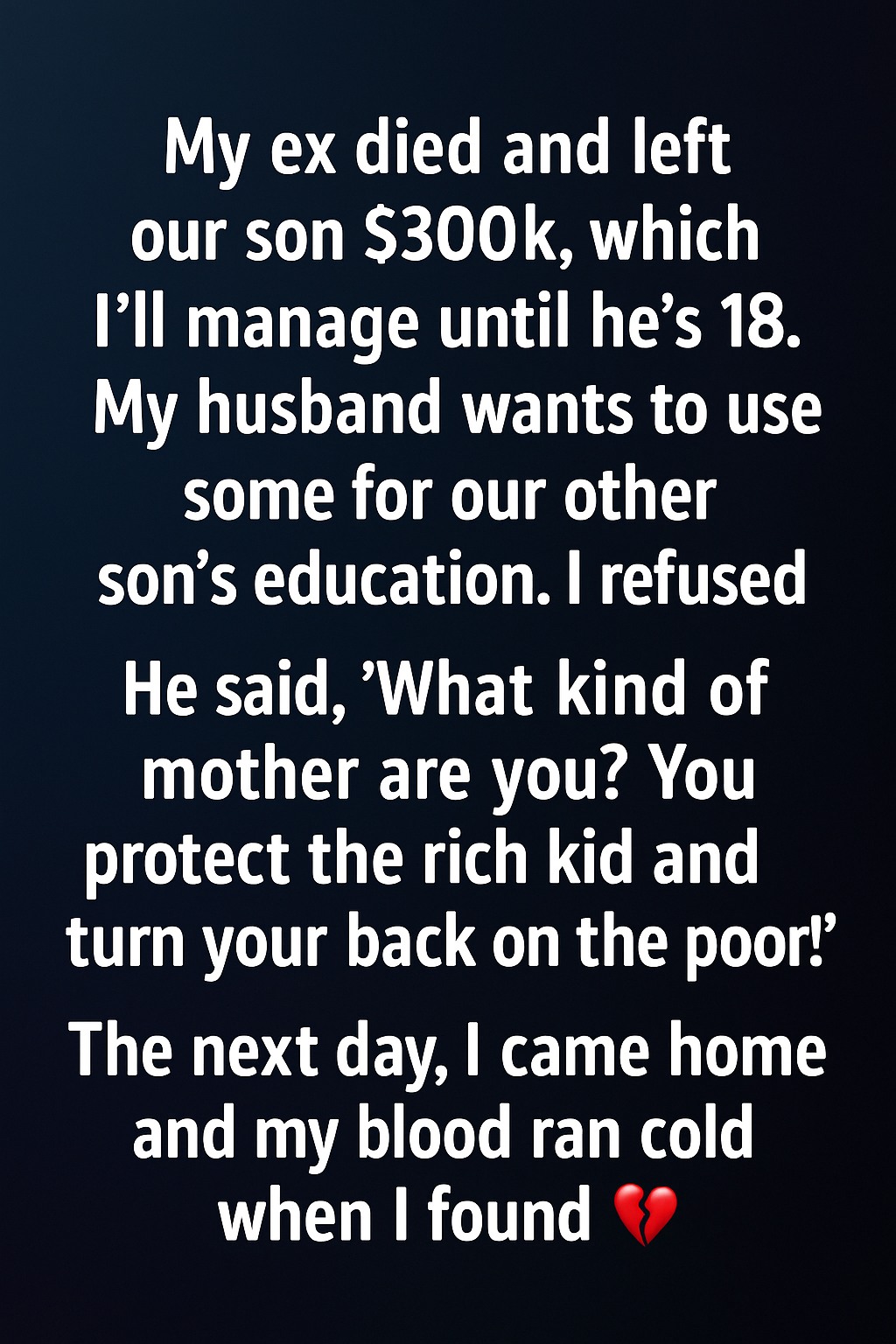 My ex-partner passed away unexpectedly a few months ago. In his will, he left our son, Liam, $300,000, which I am to manage for him until he turns 18. It was his way of ensuring Liam would always have security, no matter what happened in life.I remarried years ago, and my husband, David, has been a loving stepfather to Liam. Together, we also have a younger son, Noah. When David learned about the inheritance, he suggested we use part of it to help pay for Noah’s education.
