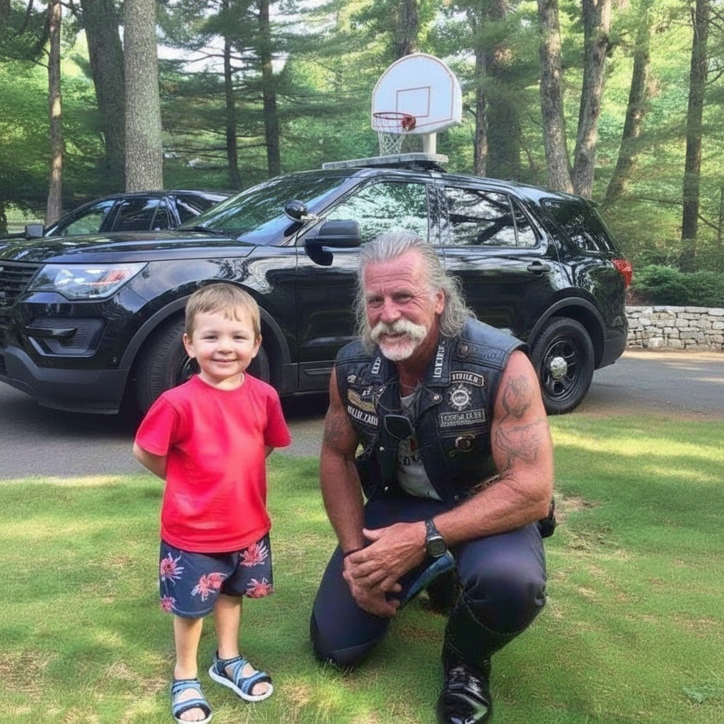 The biker looked every bit like trouble — leather vest covered in patches, gray hair spilling past his shoulders, a thick beard, and tattooed arms. Everything about him screamed danger to me. I could practically hear my father’s voice — a retired police officer — warning me to stay away from “men like that.”