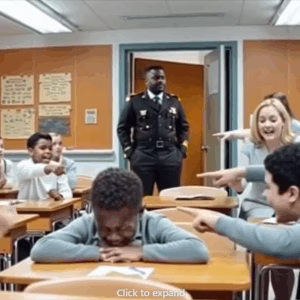 The students stared at him, wide-eyed. The teacher shuffled awkwardly, guilt pouring into her expression.