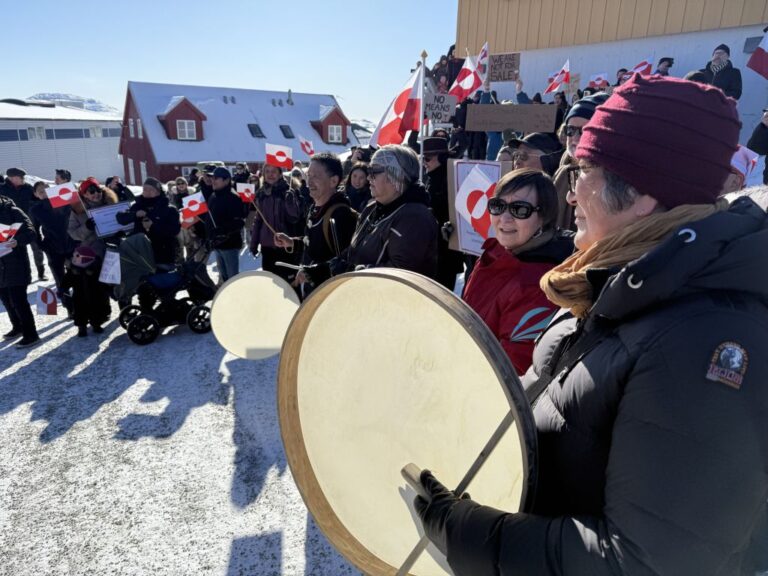 Around 1,000 Greenlanders gather in the city center and march to the US consulate building located on the outskirts of the city to protesting US President Donald Trump’s recent remarks on the sovereignty of their country, in Nuuk, Greenland on March 15, 2025. (Photo by Ahmet Gurhan Kartal/Anadolu via Getty Images)